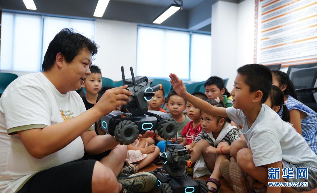 7月21日,站东街道的工作人员给孩子们讲解智能机甲机器人的构造知识。新华社记者 胡晨欢 摄