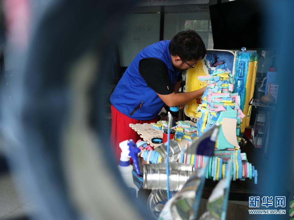 7月20日,在自己经营的潜水俱乐部,韩汉整理经过消毒处理制作成的海洋垃圾艺术作品。新华社记者 王南 摄