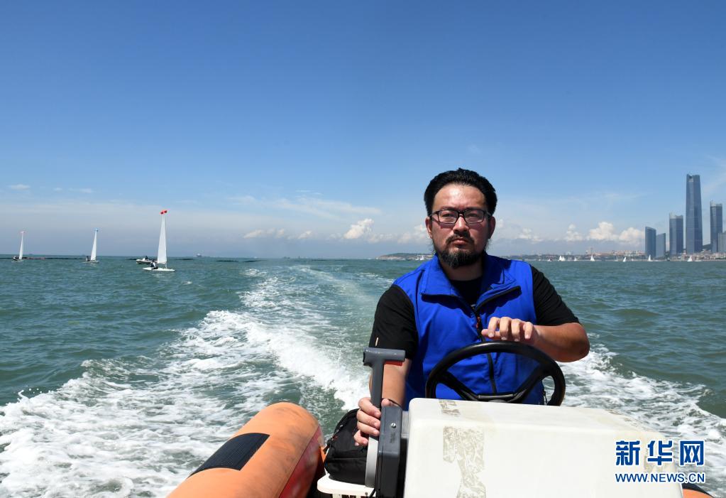 7月21日,韩汉驾船出海查看青岛浮山湾海域浒苔分布,为渔船清理打捞提供信息。新华社记者 李紫恒 摄