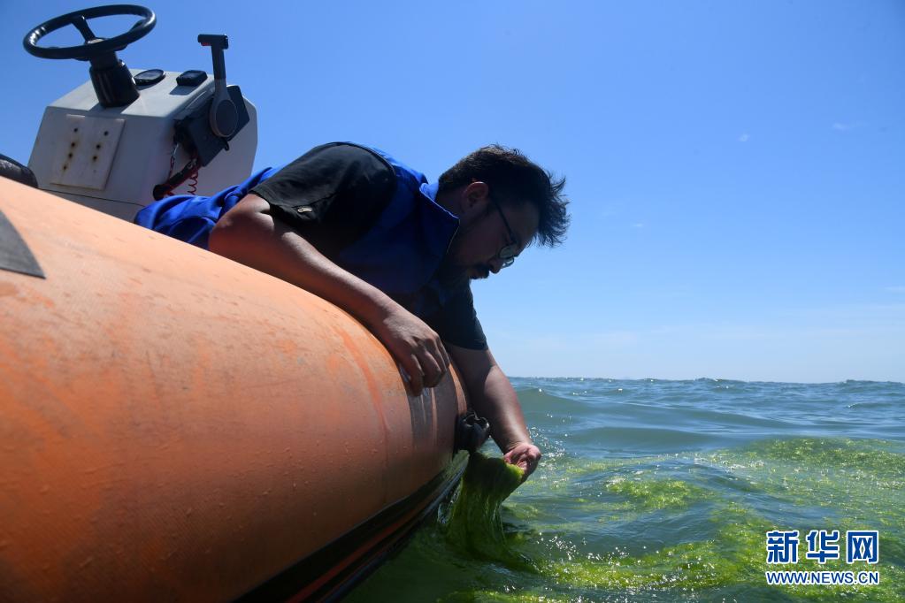 7月21日,在青岛浮山湾海域,韩汉出海查看浒苔分布及漂移情况,为渔船清理打捞提供信息。新华社记者 李紫恒 摄