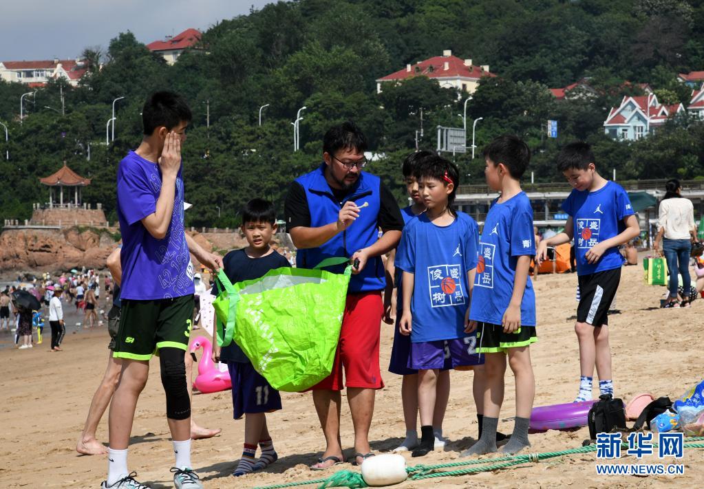 7月21日,在青岛第一海水浴场,韩汉带领孩子们在海滩上捡拾垃圾。新华社记者 李紫恒 摄