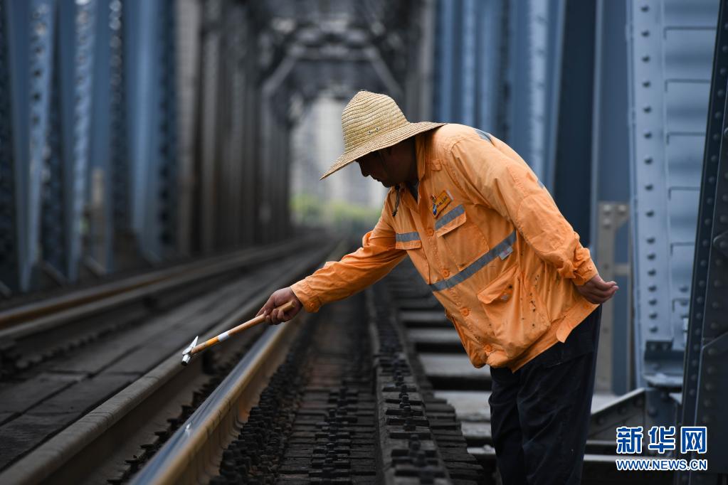 7月20日,桥隧工张道忠在蚌埠淮河铁路大桥上检查螺栓。新华社记者 张端 摄