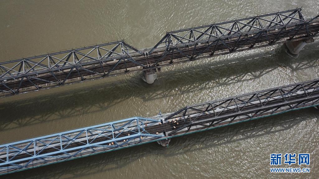 7月21日,桥隧工在蚌埠淮河铁路大桥(画面下方)进行养护检修作业(无人机照片)。新华社记者 张端 摄