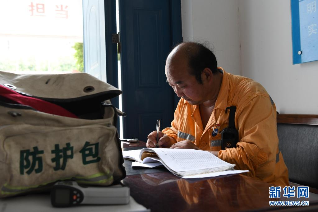 7月21日,桥隧工张道忠在蚌埠工务段蚌埠桥梁车间进行考勤记录。新华社记者 张端 摄