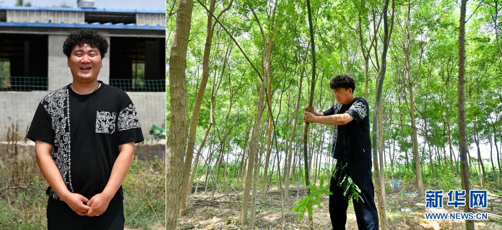 拼版照片:左图为山西省运城市盐湖区陶村镇东纽村村民刘凡在苗木基地前;右图为刘凡在修整苗木(7月16日摄)。今年27岁的刘凡曾在浙江打工,2016年他在老家陶村镇与几位村民共同创办苗木种植专业合作社,承包140多亩土地用于种植芍药、牡丹、卫矛、槐树等苗木。他希望能带领更多乡亲发展苗木产业,让家乡绿起来的同时富起来。