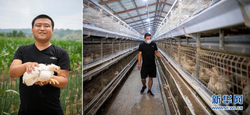 拼版照片:左图为栗利军在展示养殖的肉鸡;右图为在山西省长治市沁县峪口村,栗利军在查看肉鸡的生长情况(7月16日摄)。栗利军是山西省长治市沁县峪口村人,曾在外打工。2015年,了解到村里为鼓励肉鸡养殖出台了一系列优惠政策,栗利军返乡开始发展肉鸡养殖。目前,栗利军共有2个肉鸡养殖大棚,年出栏量可达到30万只,带动本村70余名村民在家门口就业。