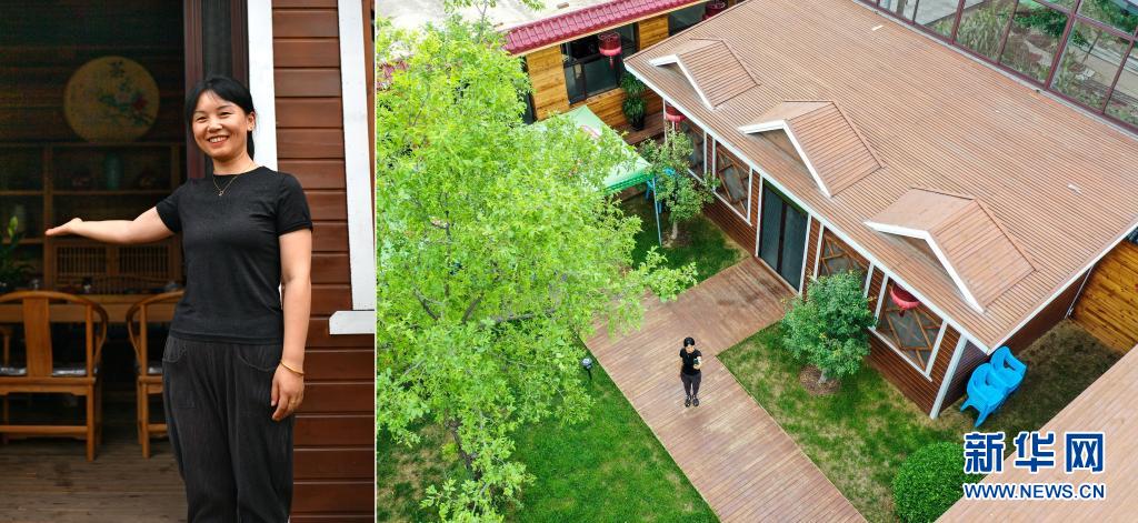 拼版照片:左图为7月7日拍摄的王晓燕在自家的家庭旅馆;右图为王晓燕在家庭旅馆的院子里用视频方式为游客介绍住宿条件(无人机照片,7月7日摄)。2021年初,太原市小店区刘家堡乡刘家堡村村民王晓燕听说家乡要大力发展旅游业,便辞职回村,把自家的几个老院子翻修成家庭旅馆。为了吸引更多顾客,王晓燕邀请专业的连锁酒店公司对旅馆进行设计装修,给每个院子制定特色主题。旅馆开业后成了小有名气的“打卡”地。