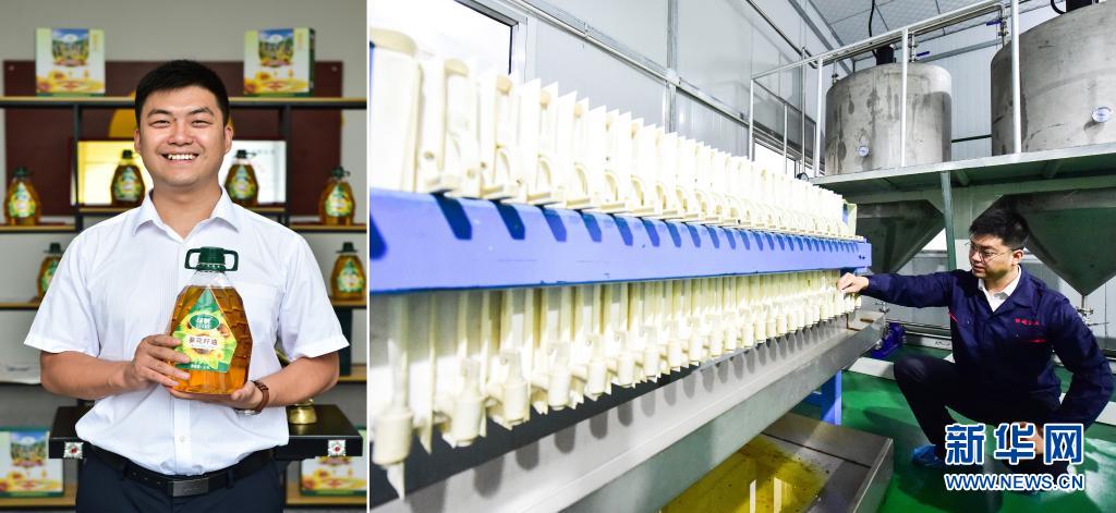 拼版照片:左图为杨鹏忠在展示自己公司出产的食用油;右图为在山西省昔阳县北石龛村,杨鹏忠在检查榨油设备(7月21日摄)。杨鹏忠曾在外地创业。2019年,为了帮助乡亲们解决核桃滞销难题,他回村创办食用油加工企业,公司生产的核桃油和葵花籽油物美价优,很快便得到市场认可,还带动不少当地农户在家门口就业增收。
