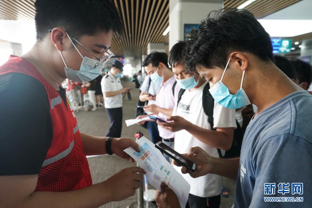 7月22日,在南京站站前广场核酸检测点,志愿者帮助旅客登记信息。