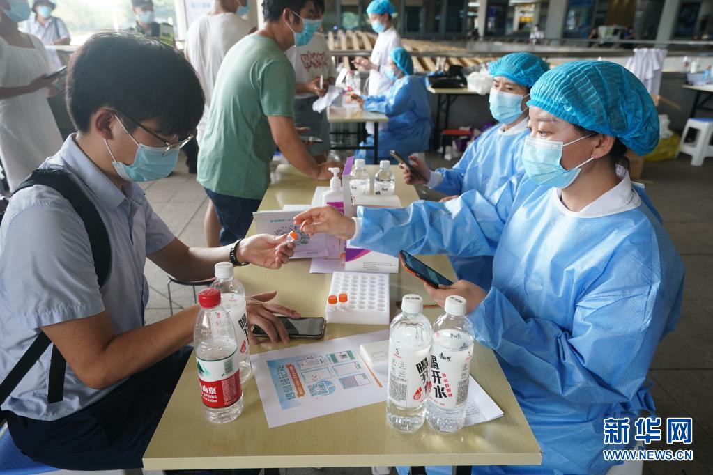 7月22日,在南京站站前广场核酸检测点,工作人员给旅客发放取样瓶。