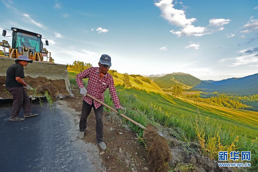 工人在喀纳斯景区进行道路拓宽施工(7月21日摄)。