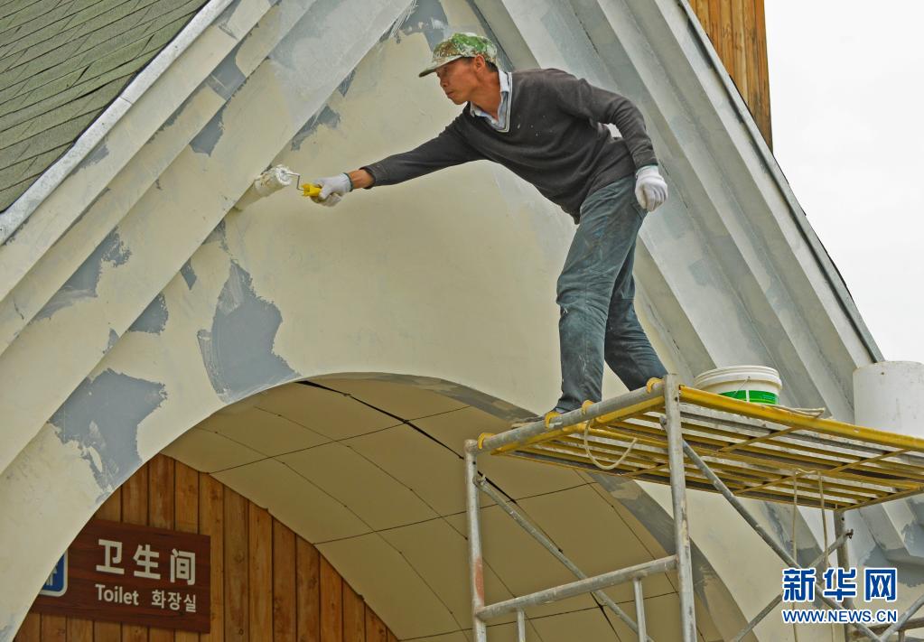 7月22日,一名工人在喀纳斯景区粉刷公共卫生间墙壁。
