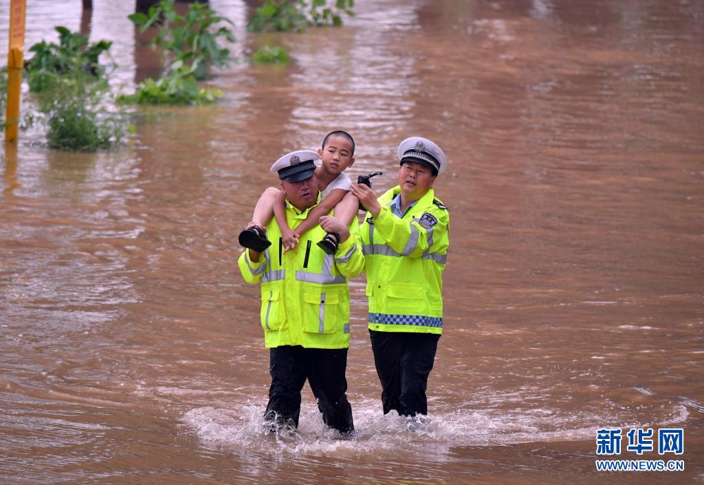 7月22日,在卫辉市黄庄村,河南省高速交警总队三支队民警帮助一名小朋友转移。