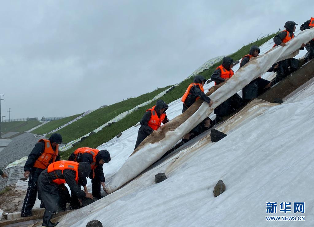 7月20日,河南省温县人武部组织民兵在南水北调中线穿黄工程温县段加固覆盖护坡(手机拍摄)。