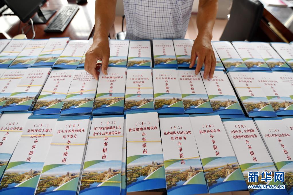 7月22日,河北省迁安市万宝沟村综合服务站工作人员在整理“政策找人、服务上门”办事指南。