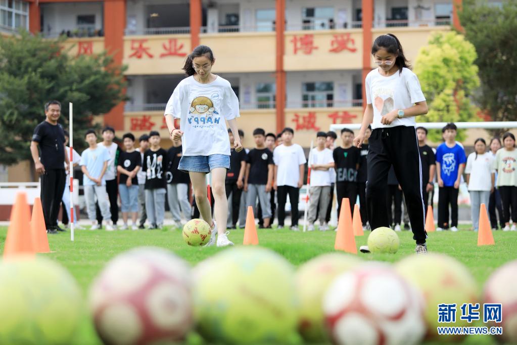 7月22日,在淮北市相山区张集中学,学生们在上足球课。