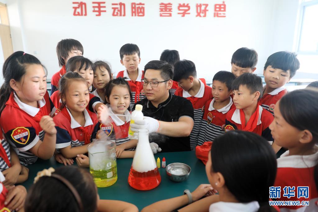 7月22日,在淮北市相山区郭王小学,老师为孩子们演示科学小实验。
