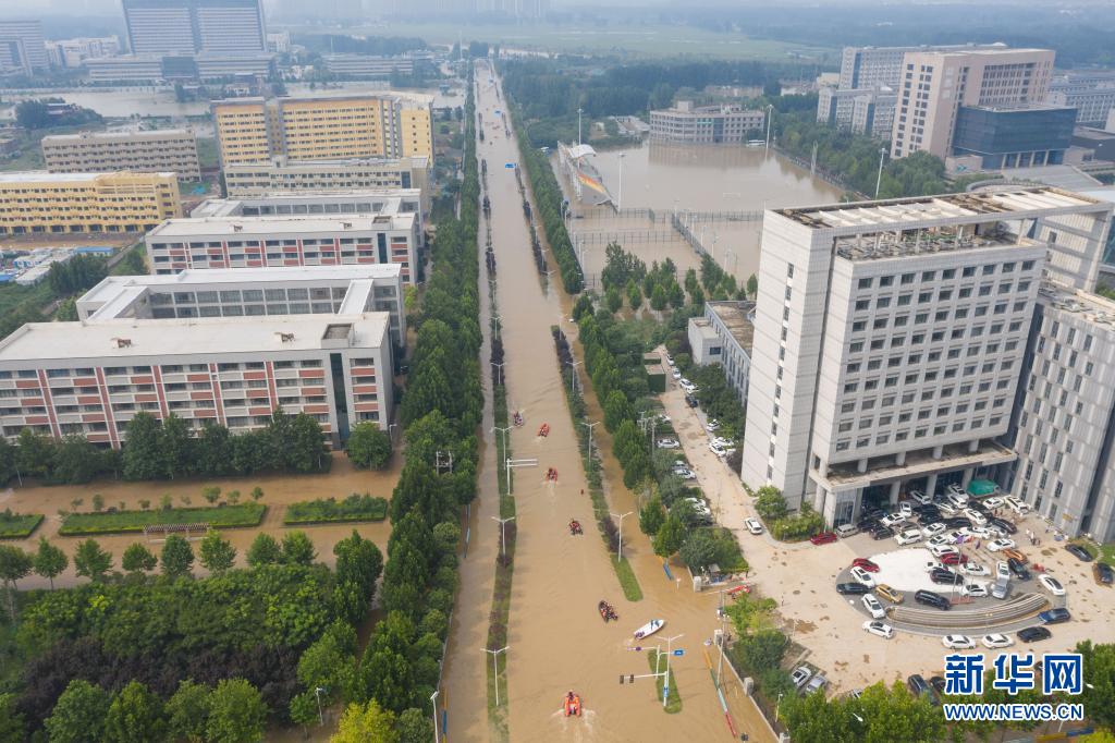 7月22日,在阜外华中心血管病医院附近的锦绣路与郑开大道交叉口,救援人员利用舟艇转移人员(无人机照片)。