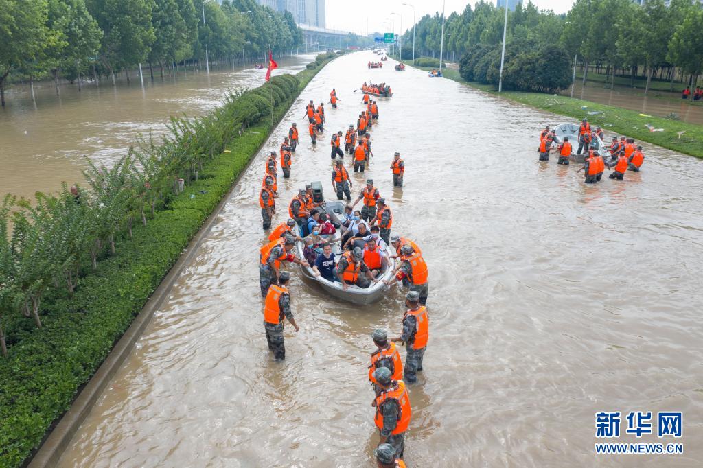 7月22日,在阜外华中心血管病医院附近的锦绣路与郑开大道交叉口,救援人员利用舟艇转移人员(无人机照片)。