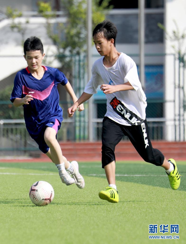7月22日,在华蓥市双河第二中学,参加暑期校园体育托管班的学生在踢足球。