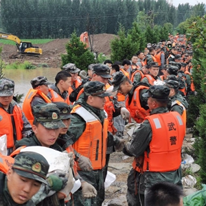 7月21日,武警河南总队新乡支队官兵在新乡市共产主义渠获嘉段搬运沙袋封堵管涌(手机拍摄)。新华社发(翟飞飞 摄)