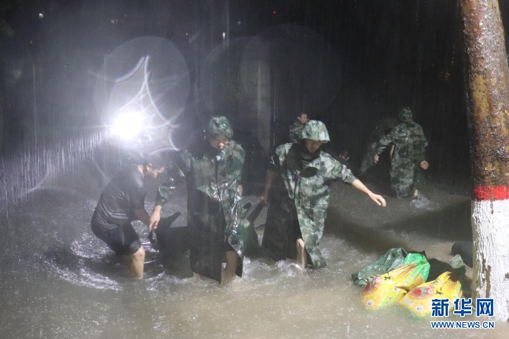 7月21日,某信息通信旅驻新乡部队官兵为确保抢险救灾部队指挥通联不间断,紧急排除营区积水。新华社发(朱佳豪 摄)