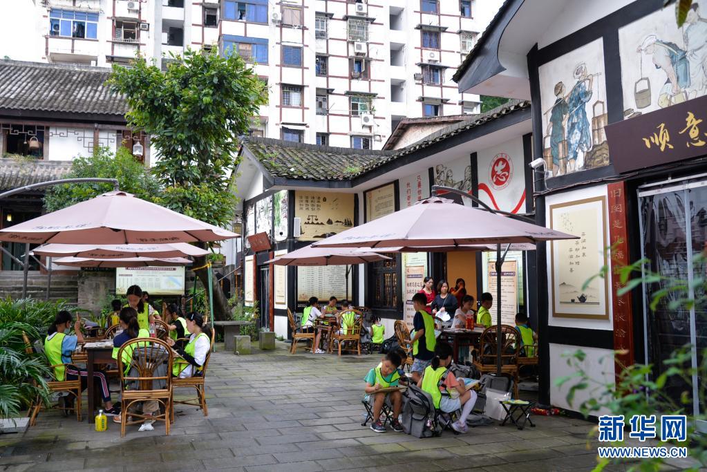 孩子们在重庆磁器口古镇的一处院子内画画(7月21日摄)。