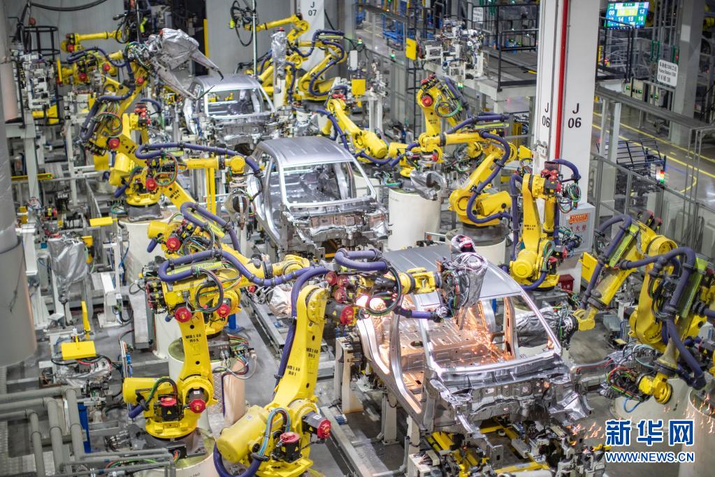 在重庆金康新能源汽车有限公司,智能化焊接机器人在进行焊接作业(4月2日摄)。新华社记者 黄伟 摄