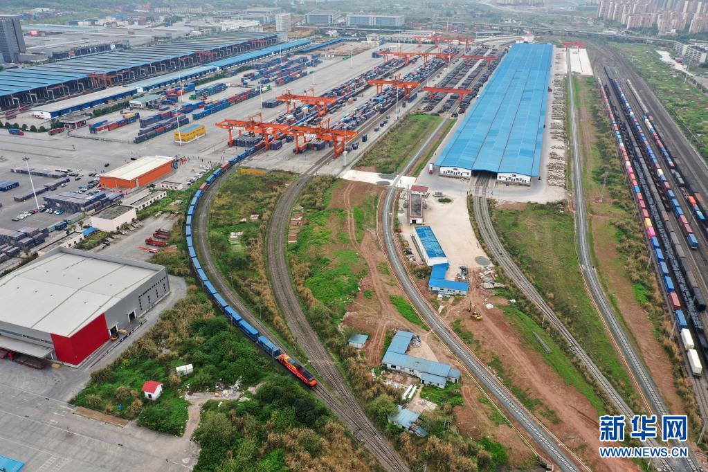 中欧班列(渝新欧)十周年纪念专列从重庆团结村站发出(3月19日摄,无人机照片)。新华社记者 唐奕 摄