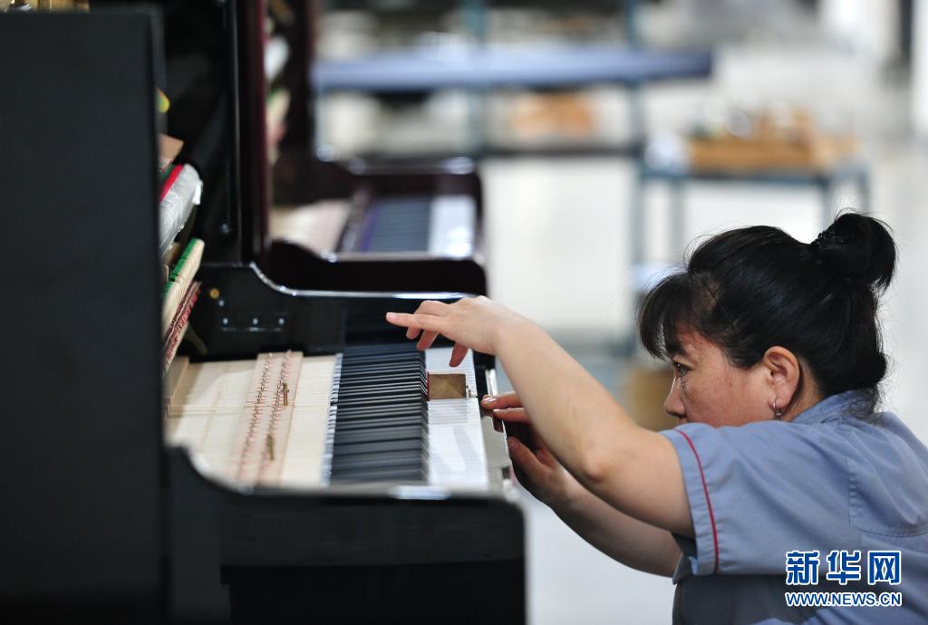 7月22日,河北省肃宁县一家乐器生产企业的工人在钢琴生产车间工作。