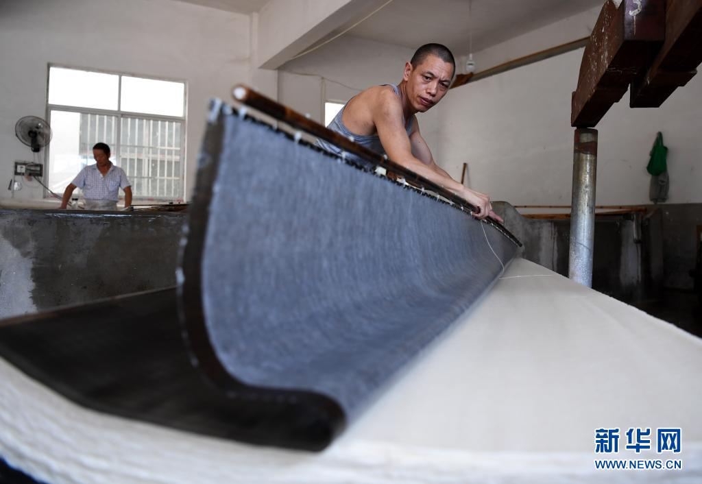 7月21日,在泾县丁家桥镇一家宣纸企业,工人在进行捞纸作业。新华社记者 刘军喜 摄