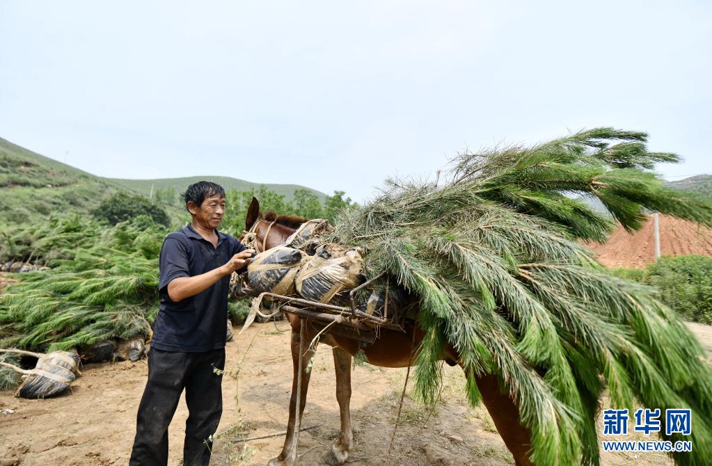 7月23日,造林人员在河北省滦州市鸡冠山生态农业产业园内准备苗木。