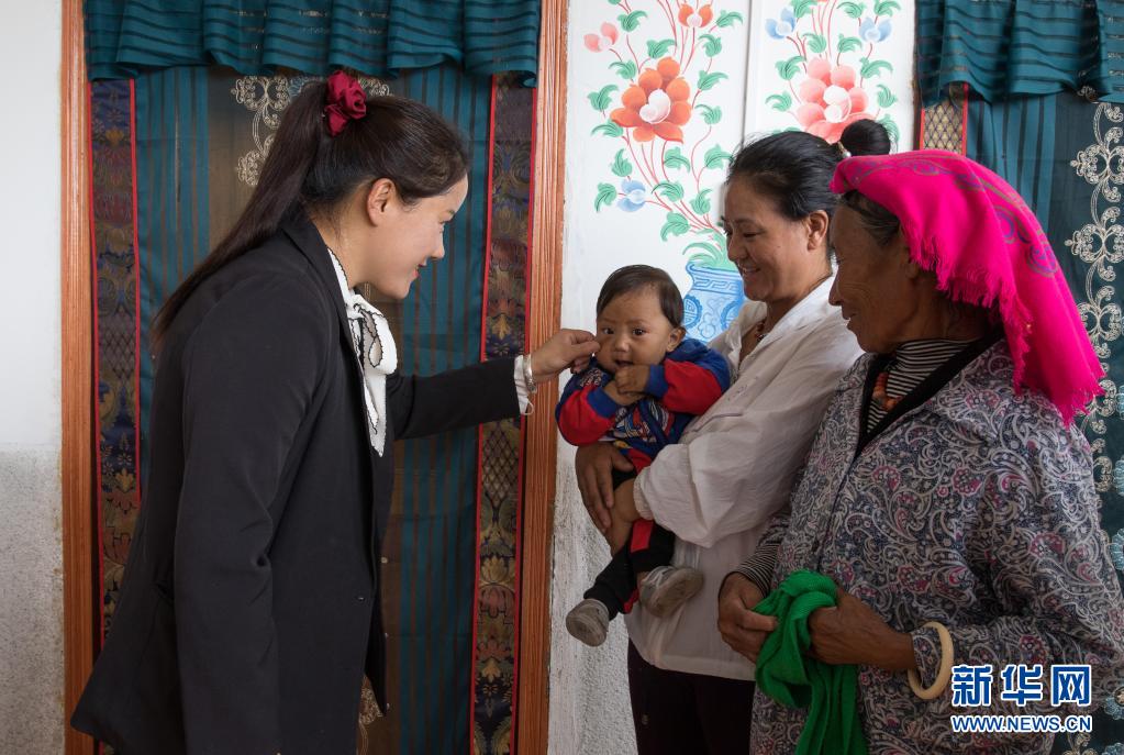 7月22日,措旺卓玛(左)在逗达瓦(中)的孩子。过去一年里,她替达瓦卖出玉米、鸡爪谷等特产。