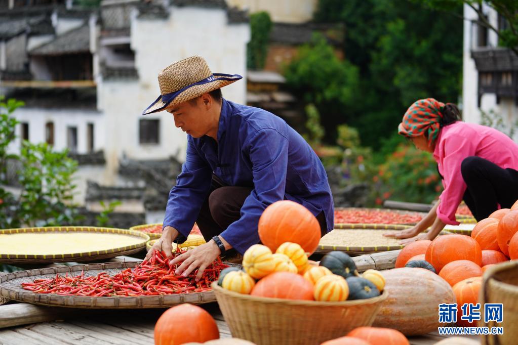 7月23日,曹加祥(左)在篁岭“晒秋”。