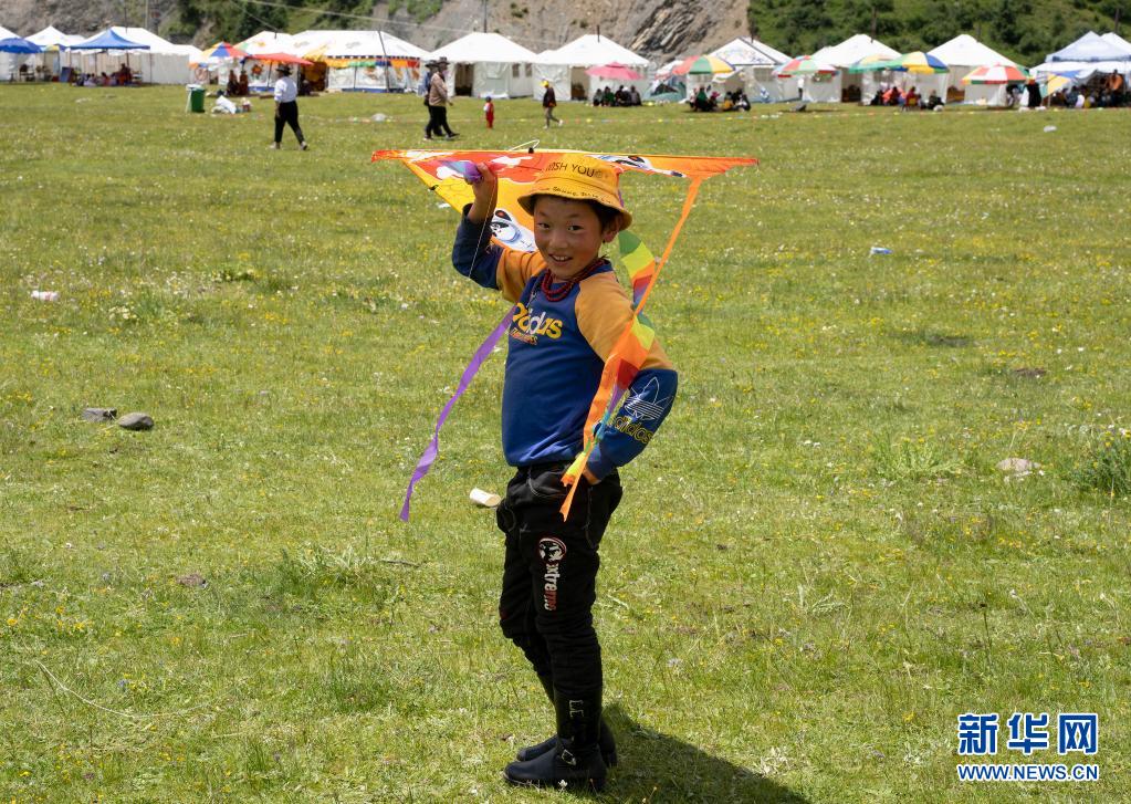 7月22日,小朋友在道孚县玉科草原上放风筝。