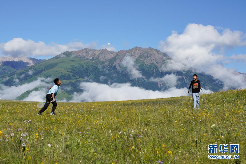 7月22日,小朋友在道孚县白日山草原上玩耍。