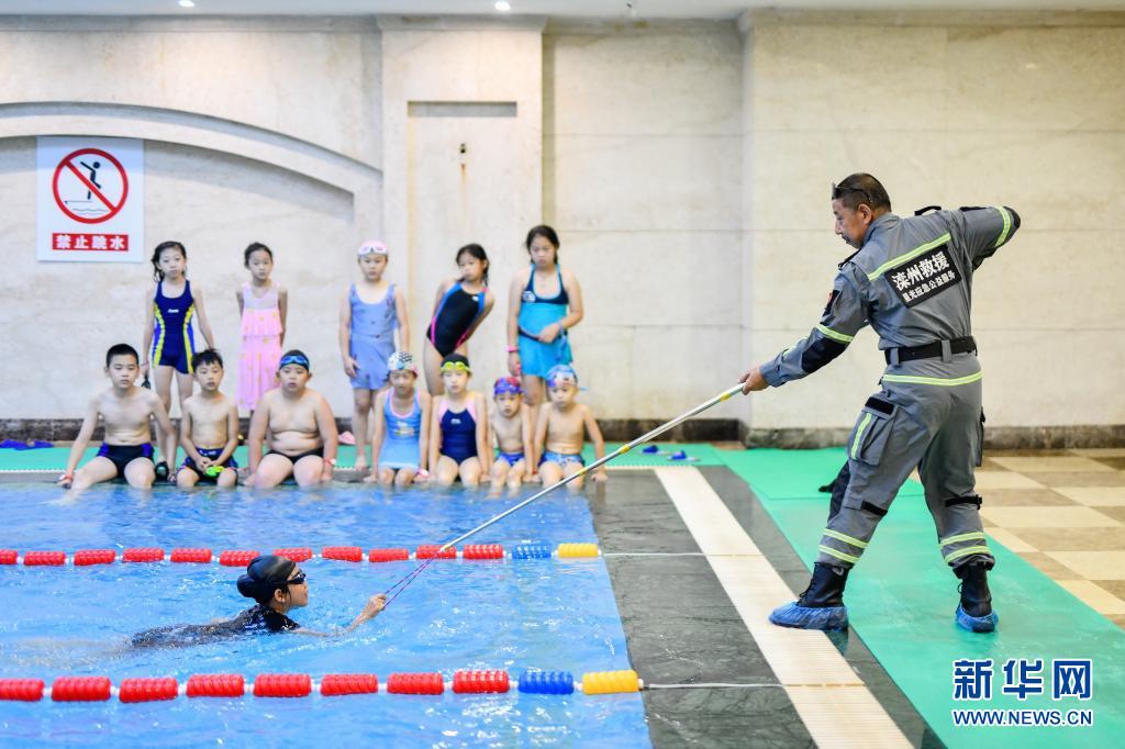 7月24日,河北省滦州市星光公益志愿服务队的志愿者在为孩子们演示落水后的应急救援方法。