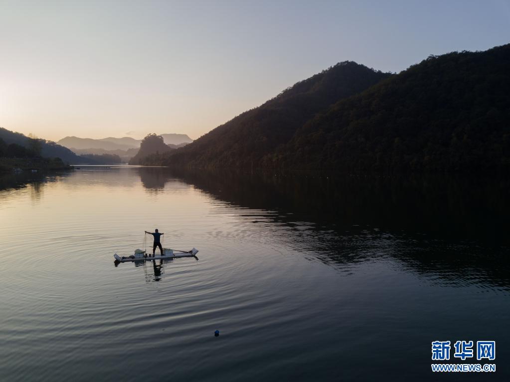 在福建省三明市将乐县高唐镇常口村,村民在金溪捕鱼(2020年11月20日摄,无人机照片)。