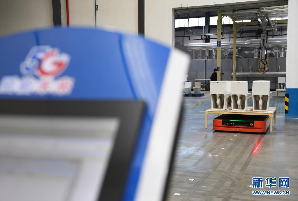 在福建省泉州市永春县,智能机器人在福建省首家5G智慧陶瓷工厂——九牧永春智慧制造产业园区101#智慧工厂运送洁具(1月13日摄)。
