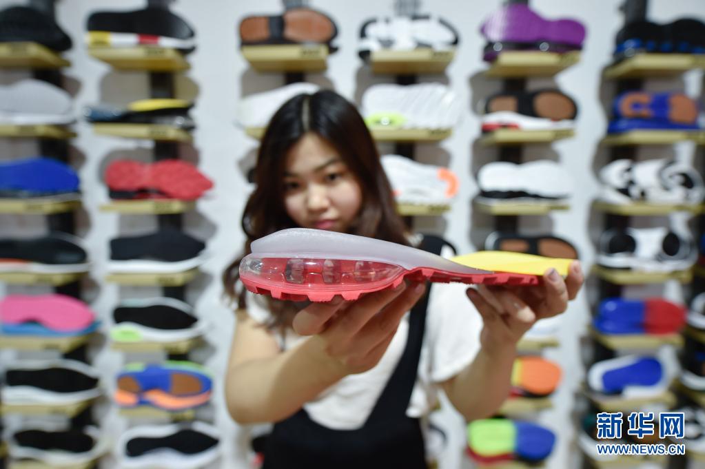 在福建晋江国际鞋纺城,一家鞋底生产企业的销售人员在展示自主生产的气垫鞋底(2017年4月20日摄)。