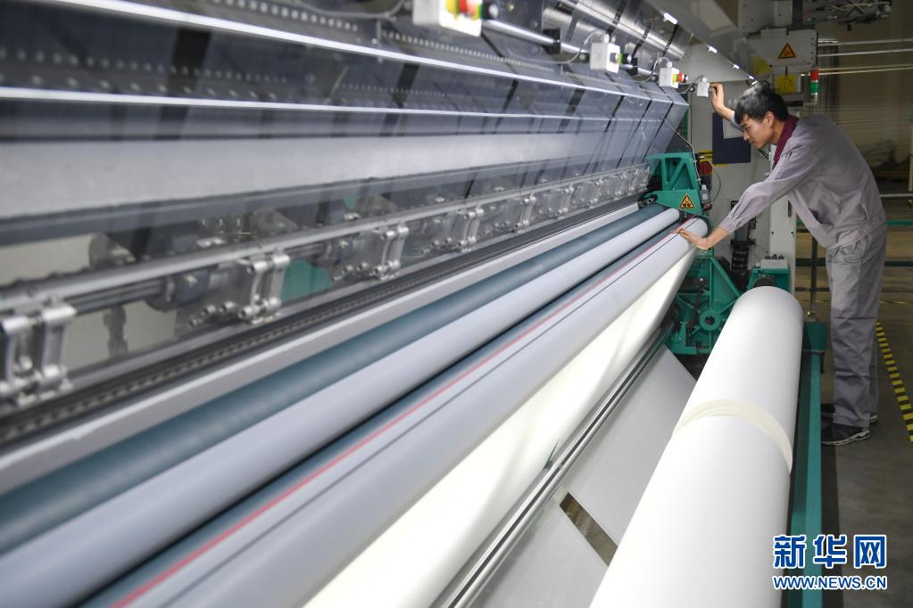 在位于福建省福州市长乐区的恒申控股集团与德国卡尔迈耶集团的联合研发中心,工人在德国进口的纺织设备旁作业(2018年11月28日摄)。