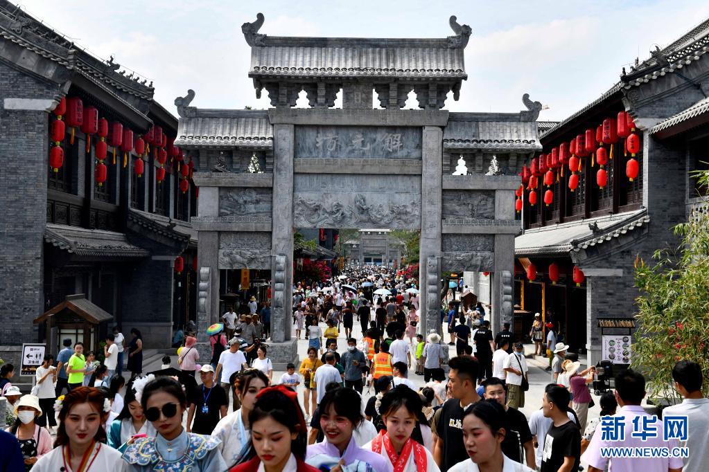 7月24日,游客在莒县莒国古城商业街区游览。