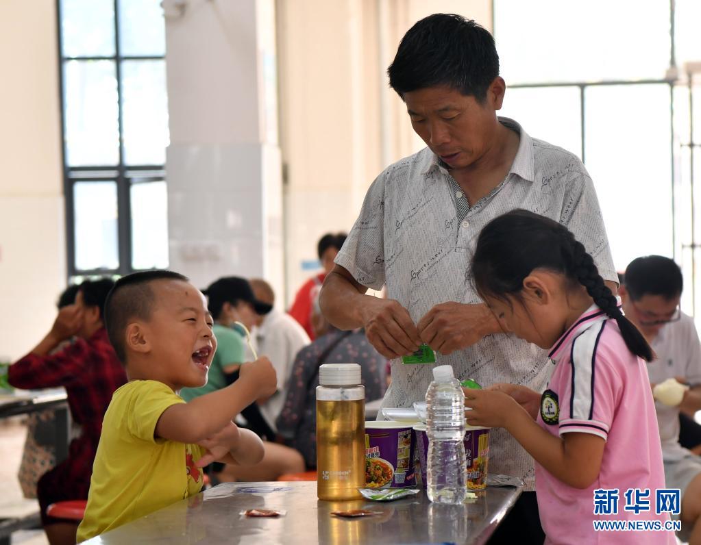 7月24日,群众在淇县职业中等专业学校安置点内准备吃饭。
