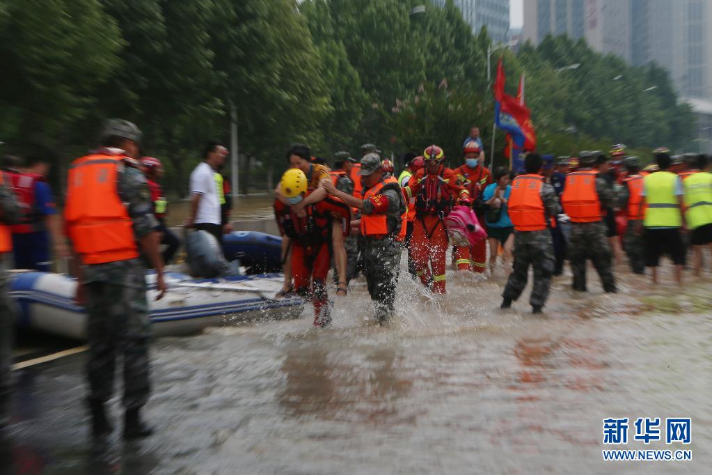 7月22日,在郑州市中牟县阜外华中心血管病医院附近,救援人员在转移群众。