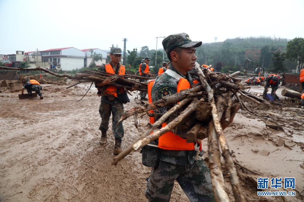 7月24日,陆军第83集团军某工化旅官兵在巩义市小关镇清理道路。