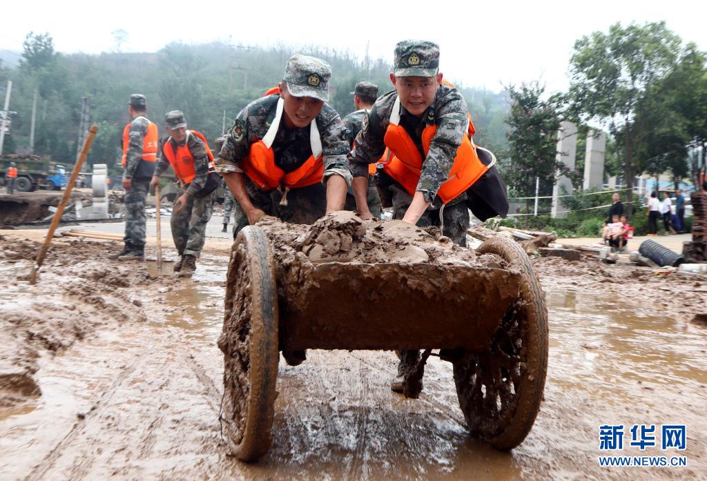 7月24日,陆军第83集团军某工化旅官兵在巩义市小关镇清理道路淤泥。