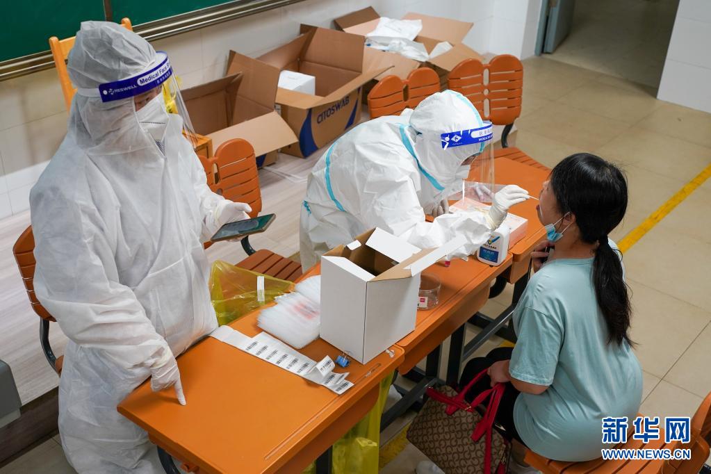 7月25日凌晨,汪雨(中)在南京市江宁区龙西社区核酸检测点为社区居民进行核酸检测取样。新华社记者 李博 摄