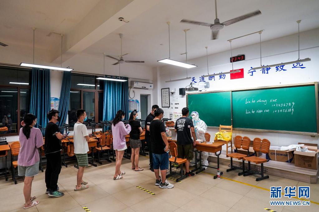 7月24日晚,汪雨(右一)在南京市江宁区龙西社区核酸检测点为社区居民进行核酸检测取样。新华社记者 李博 摄