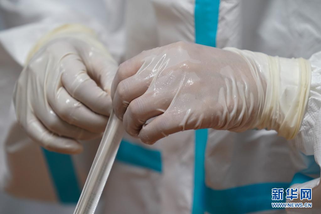 7月24日晚,汪雨在南京市江宁区龙西社区核酸检测点准备为社区居民进行核酸检测取样,她的手套里面全是汗水。新华社记者 李博 摄