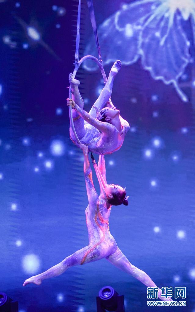 7月24日,演员在表演杂技《大鱼——空中吊环》。